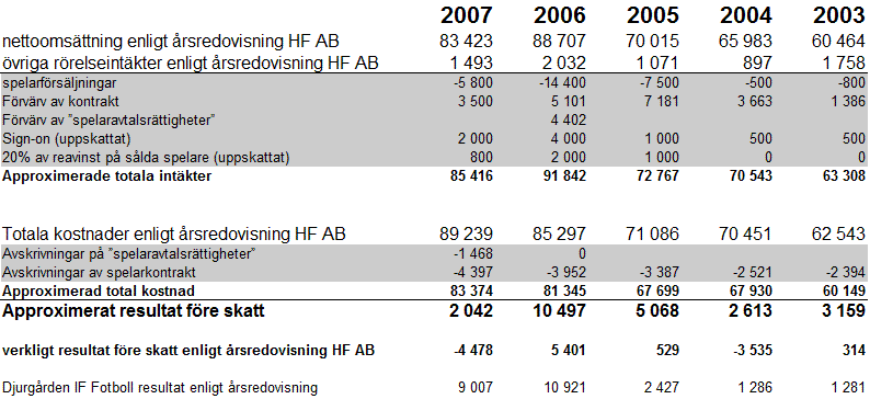 Det intressanta vore naturligtvis att skatta fiktiva bolaget Hammarby Transfer AB:s resultat och jämföra med Djurgården Fotboll AB:s dito samt beräkna avkastningen på investerat kapital. Kanske en annan gång… efter att 2008 års siffror finns redovisade.