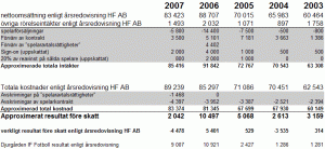 saxat från dif fotboll if årsred.>”Spelarkontrakt som finansieras genom att vinstandelsbevis tecknas av riskkapitalbolag betraktas ur bolagets synvinkel som en försäljning av spelare (spelartransfer) och redovisas i nettoomsättningen.”>>Tänkte på samma sak faktiskt…>Jag är relativt obevandrad kring skatter. Offra föreningens nettoresultat till förmån för förlustavdrag i DF AB?>>IFK G gjorde ju liknande transaktion 2007. Packade ihop x antal spelare i den befintliga truppen och sålde rätten till en del av framtida försäljningar av dessa till IFK Gbg AB för 11.9 miljoner.>>lite intressant faktiskt…>AIK:s setup är ju helt annorlunda gentemot Agent 03 och HF:s transferkorg är ju en skuld som endast innebär förändringar på balansräkningen. (förutom framtida räntebetalningar som blir en finansiell kostnad)