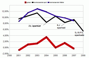 1. (Blå linjen) Djurgården har sakta men säkert tappat marknadsandelar* (vad gäller driftintäkter) och därmed resurser i förhållande till sina allsvenska konkurrenter.