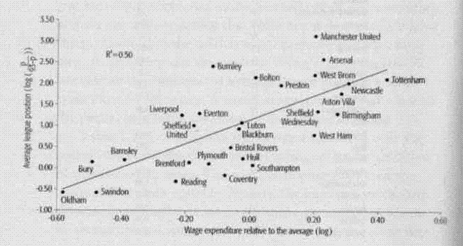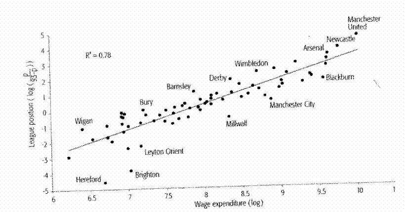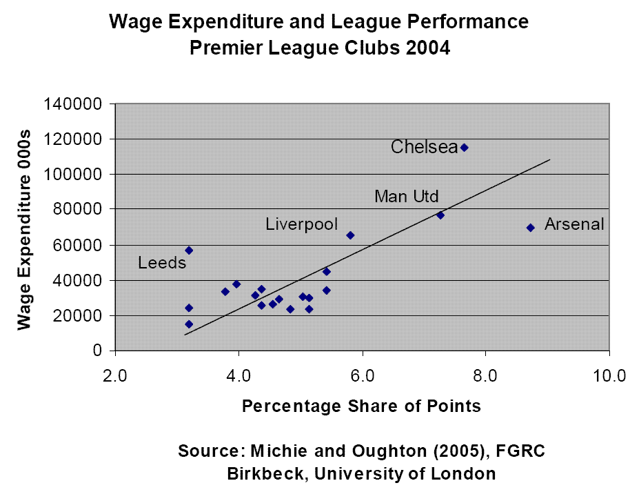 Bilden visar sambandet mellan engelska klubbars personalkostnader (spelare plus tjänstemän) och sportsligt resultat.