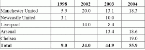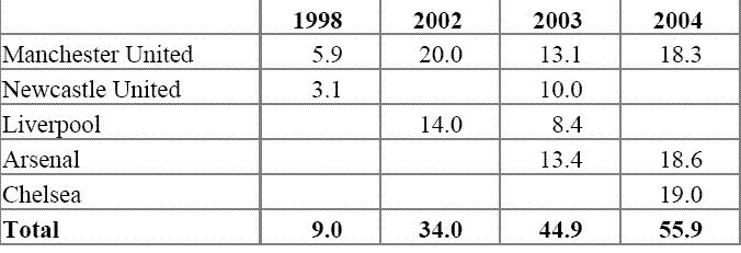 Source: Deloitte and Touche and FourFourTwo (1999) and Deloitte (2004a) and Deloitte and Touche