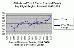 bilden visar ett index där man mäter Premier Leagues nykomligars poängandel. Som synes säger trenden att nykomlingarna tar färre poäng sedan PL startade 1992.2) 50-25-25 har inte missgynnat storklubbarna.