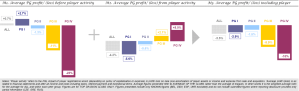 Fotbollseuropa uppdelat i fyra olika ligagrupper. PGI – PGIV och dess ekonomiska nyckeltal.Från vänster: rörelsemarginal, transfernetto, totalt resultat.