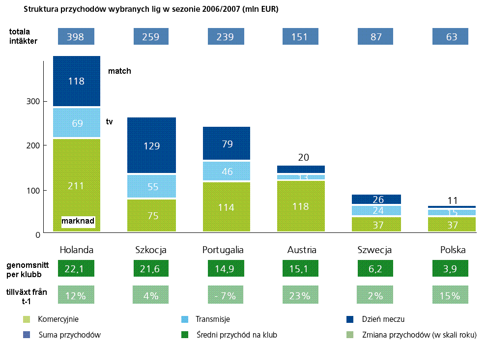 Rapporten avser 2007 och det finns annan intressant och aktuell information jag funnit och som inte var inkludrad. Polska ligan sålde i början av 2008 nya TV rättigheter till ett pris av 125 miljoner Zloty per år fram till 2011. Det motsvarar ca 340 miljoner kronor, vilket med andra ord är betydligt mer än priset för de allsvenska TV rättigheterna.