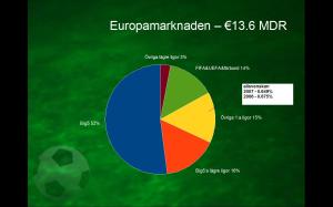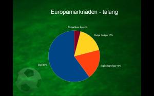 Allsvenskan har 0.64% av den europeiska marknaden. Räknar vi bort UEFA och räknar bara på ligorna blir allsvenskans marknadsandel 0.69%