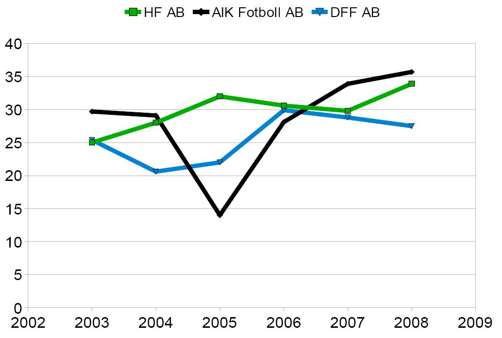 tabellen visar intäkter (msek) från ”marknad” plus souvenirer. Källa: Årsredovisningar Hammarby Fotboll (2003 – 2008). Totala intäkter i bolagen Djurgården Fotboll Försäljning AB (2006 – 2008) samt Djurgården Marknad AB (2003-2005)*. Årsredovisning AIK Fotboll AB (2003-2008), The Terrace exkluderat.