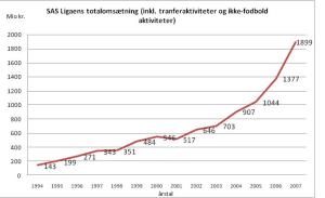 Vi ser ganska tydligt att tävlingsbalansen i Danmark post 2003 har försämrats. Ganska kraftigt till och med. Än så länge har det inte påverkat efterfrågan på dansk ligafotboll negativt där tillväxten varit mycket stark.