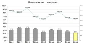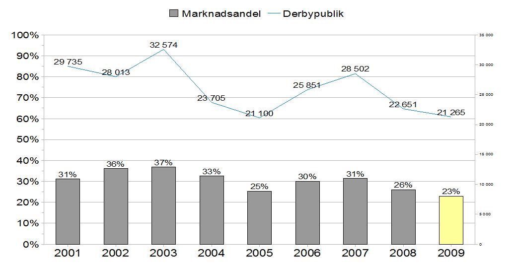 De tre huvudstadsklubbarnas marknadsandel. 2003 genererades 37% av allsvenskans rörelseintäkter (exkl spelatransfers) i Stockholm. Nyckeltalet är korrigerat och tar hänsyn till förändringar av antalet lag (2008) och är därför jämförbart över tiden. 2009 är en prognos. Datakälla: svenskfotboll.se samt årsredovisningar från DFAB, Djurgården Marknad AB samt Djurgården Fotboll Försäljning AB.
