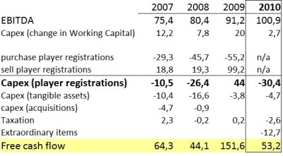 Tittar vi på kassaflödena så är ser det ut enligt nedan tabell. Klubben har under bokslutsåret nettoinvesterat i spelartruppen till ett belopp av £30.7 miljoner. 2009 års försäljning av Christiano Ronaldo var en extraordinär händelse och försäljningen berodde varken på brist på pengar eller skuldsättning utan helt enkelt på att priset som Real Madrid betalade med råge översteg det mervärde som spelaren genererade åt klubben.