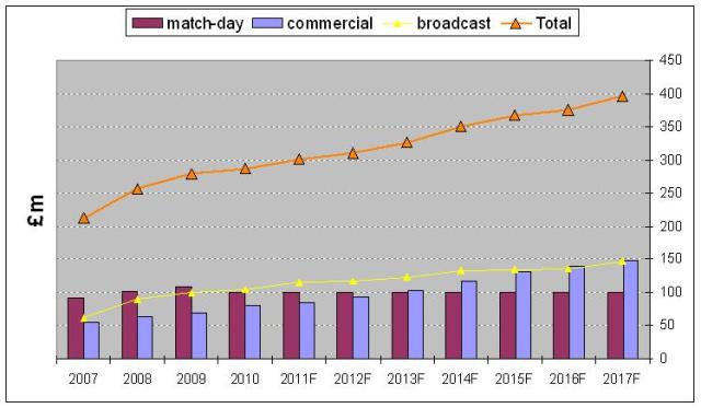 Den största potentiella tillväxten förväntas däremot att finnas hos ”övriga partners”. I detta inlägg beskrev jag klubbens brand leveraging strategi. Jag antar att denna strategi kommer att bidra till en genomsnittlig tillväxt på 10% för kategorin commercial&retail fram till 2017. En aggressiv tillväxtfaktor men tittar vi historiskt så har klubben, sedan 2005, i det närmaste fördubblat intäkterna i detta segment. En liknande utveckling under de kommande sju åren bör anses möjlig, inte minst om strategin på tillväxtmarknaden Asien faller väl ut.