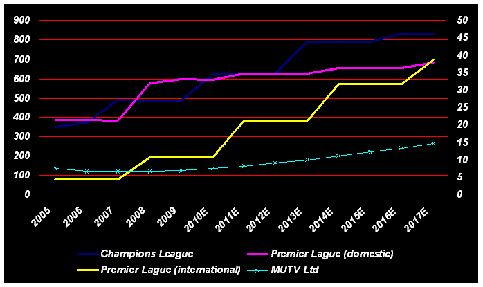 Den egna kanalen MUTV har upplevt en relativt låg tillväxt och här krävs det förbättrade nyckeltal. 2007 förvärvade Manchester United 33% från ITV till ett pris av £3.4 miljoner. Denna värdring indikerar en förväntad årlig tillväxttakt på 10%.