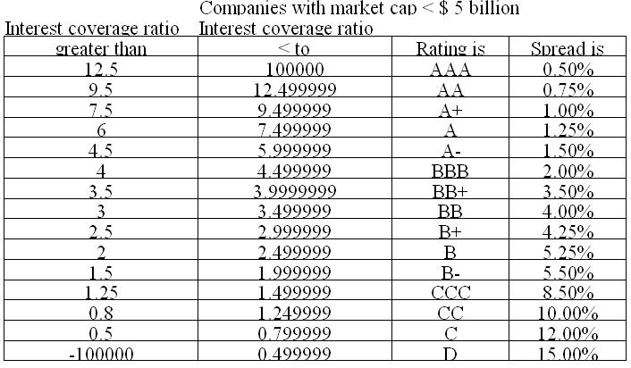 Tabellen nedan är en approximation av marknadens värdering på olika typ av obligationer kontra bolagens respektive interest coverage ratios. Den är baserad på historiska observationer. Spread är riskpremien, det vill säga avkastning (yield) minus den riskfria räntan (avkastning på statsobligationer).