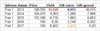 Däremot, de investerare som tror på ett sådant scenario och det inträffar, kommer att belönas med en mycket fin avkastning. Det beror dels på inlösenpriset men även på det faktum att räntan för den brittiska statsobligationen (proxy för riskfri ränta) som förfaller 2013 (