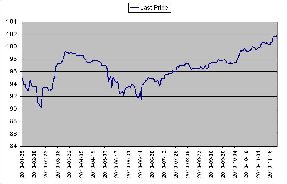 Dessa obligationer handlas på en andrahandsmarknad där investerarna kan köpa och sälja dessa på daglig basis. Det betyder att klubbens skuld värderas varje dag. Figuren nedan visar prisutvecklingen på klubbens obligationer där dessa under den senaste veckan handlades på 101.63 pence per £.
