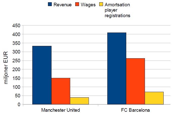 En jämförelse mellan två klubbar i den absoluta toppen av näringskedjan baserad på boksluten för säsongen 2009/10. ”Amortisation player registration” är årliga avskrivningar på köpta spelarkontrakt vilket visar hur stora de historiska spelarinvesteringarna har varit.