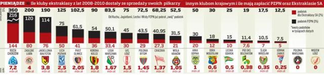 Nedan bild visar beskattningen av de polska klubbarna under 2008-2010. Röda fältet är skatten till Ekstraklasa S.A och det svarta till PZPN. Röda siffran längs ner visar den ackumulerade summan för intra-lige transfers 2008-2010. 1PLN ~ 2.25SEK