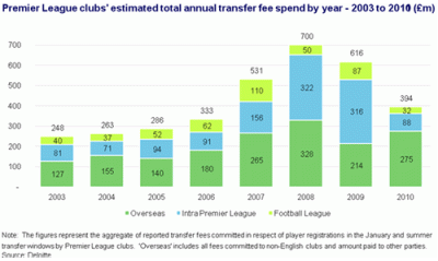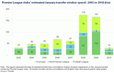 English Premier League clubs’ gross transfer spending in January 2011 is already more than double the amount spent in January 2010 (£30m) but, subject to the completion of transactions over the weekend, is likely to fall short of the record £175m reported in January 2008