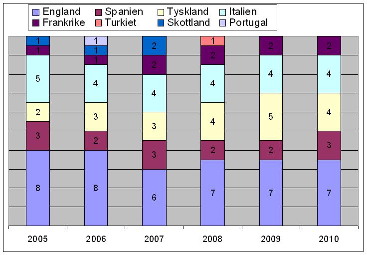 Intressant är även att se hur representationen från de europeiska ligorna har utvecklats över tid. Vi ser att de ligor som kallas för Big5 har under de senaste åren nått en fullskalig dominans. De skotska klubbarna som fortfarande har respektabla intäkter från matchdagen har fallit ifrån beroende på att intäkterna från sändningsrättigheter inte har utvecklats i samma takt som hos de till befolkning och BNP större länderna. Figuren nedan visar hur många klubbar från respektive liga finns representerade i Football Money League.