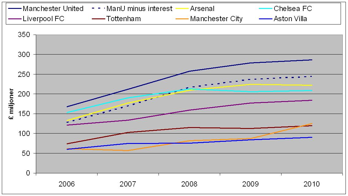 Vi får med andra ord reda på hur de kommersiella marknadsandelarna har utvecklat sig i toppen av pyramiden. Anledningen till att omsättningen är intressant och vital är det stora sambandet mellan intäkter och sportslig framgång. I engelsk ligafotbollen förklaras ligaplaceringen till 76% genom klubbens intäkter och i Spanien är förklaringsgraden så hög som 88%.