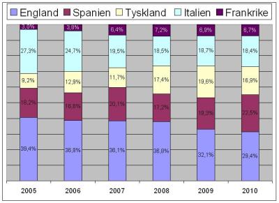 Om vi räknar på ackumulerade intäkter för representanterna från respektive liga så ser vi att de engelska klubbarna har straffats av det försvagade pundet under de två senaste åren. Tyskland har, tack vare FIFA2006 och den modernisering av arenorna detta förde med sig, vunnit marknadsandelar. Värt att notera är de franska representanternas tillväxt. Den är till största del beroende på att den franska ligan i samband med upphandlingen 2005 ändrade sin distributionsnyckel för sändningsrättigheter, från 83-9-8 till 50-30-20. En förändring som innebar att toppen i den franska pyramiden har blivit mer konkurrenskraftig på den totala marknaden. Den spanska fanan bärs av den individuella sändningsrättighet-regimen där Real Madrid och Barcelona så gott som på egen hand försvarar landets färger. De italienska representanterna i gruppen är de som hör till de stora förlorarna vad gäller marknadsandelar. Figuren nedan visar marknadsandelarna i Football Money League för respektive liga.