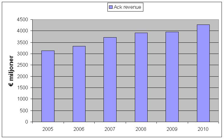 2011 förväntas tillväxten vara minst lika stor. De sju Premier League klubbarna som är med i gruppen får under nuvarande säsong ett tillskott på ungefär €20 miljoner vardera från det nya tv avtalet. Lägg därtill flera nya kommersiella avtal som de största klubbarna har tecknat under det senaste halvåret. Figuren nedan visar utvecklingen för de ackumulerade intäkterna för de 20 till omsättning största klubbarna i Europa.