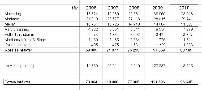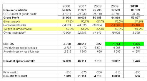 2010 års starka EBITDA ska dessutom ses med bakgrund av att laget underpresterade(?) sportsligt vilket pressade intäktssidan, främst gällande mathcdagsintäkter och premier från centrala avtal. En smolk i bägaren är det dåliga resultatet som klubben uppvisar vad gäller försäljning av varor där jag misstänker souvenirer ingår. Man tjänar inga pengar här.