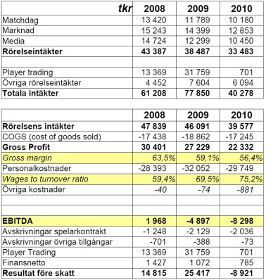 Vi ser att guldåret 2008 och till viss del 2009 var ungefär de intäkter som den gamla infrastrukturen mäktade med att generera. Vi ser även att bruttomarginalen har varit förvånansvärt låg. Klubben har fått betala mycket pengar i relation till förhållandevis låga rörelseintäkter. Personalkostnaderna tillhör mittenskiktet i ett allsvenskt perspektiv och de låga avskrivningarna på spelarkontrakt avslöjar att klubben, trots flera spelarförsäljningar de senaste åren, inte har förvärvat dyra spelarkontrakt. Reavinsterna har till stor del istället investerats i den nya arenan.