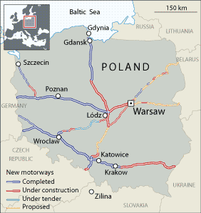 En stor bromskloss är det polska vägnätet som länge varit mycket eftersatt. Idag byggs det nya motorvägar samt andra trafikförbindelser och under den förra veckan offentliggjorde man att Polen under 2011 har investerat motsvarande 50 miljarder kronor i vägbyggen och under året har 205 km motorväg och 62 km motortrafikled färdigställts och lämnats över till trafik.