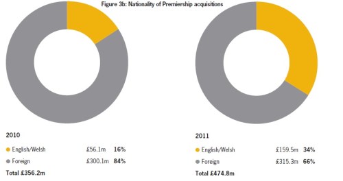 Till exempel blev de £50 miljoner i nya pengar från Roman Abramovich som Chelsea spenderade på Fernando Torres mer än det dubbla i transfereringar under 2011. Utöver de ca £20 miljonerna som gick till utlandet för Luis Soarez, förvärvade Liverpool kontraktet med Andy Carrol från Newcastle för £30 miljoner som sedan spenderade hälften av dessa under sommarens transferfönster. Om vi enbart ser till nettoutgifterna, så minskade dessa för de engelska klubbarna jämfört med motsvarande transferperiod år 2010.