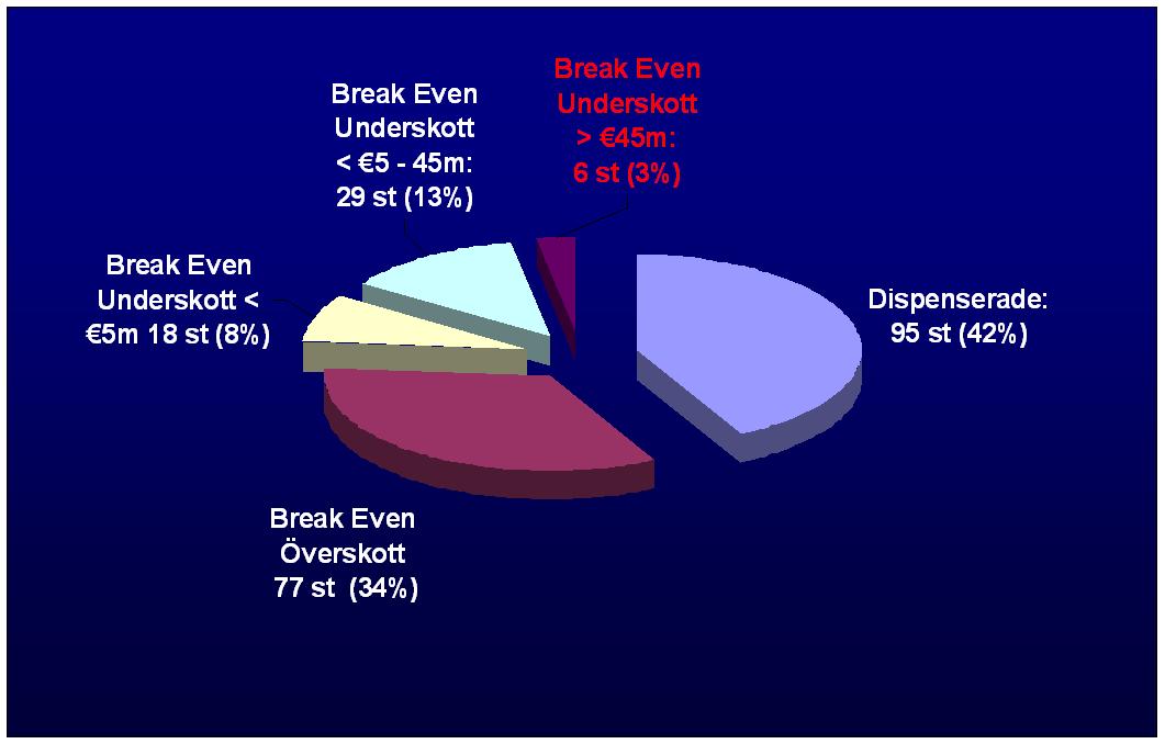 Vi kan se att 95 klubbar – vilket är så mycket som 42% av hela målgruppen inte är tillräckligt stora för att överhuvudtaget omfattas av regelverket. 77 klubbar har redovisat ett positivt resultat över en treårsperiod. Ytterligare 18 klubbar rymmer sig inom de €5 miljoner som man får ha i underskott och 29 klubbar klarar av de €45 miljonerna som klubbarna kan redovisa i förluster givet att de finansierar sig genom eget kapital eller ”liknande”. Denna nivå gäller under de första åren för att sedan minska till €30 miljoner.