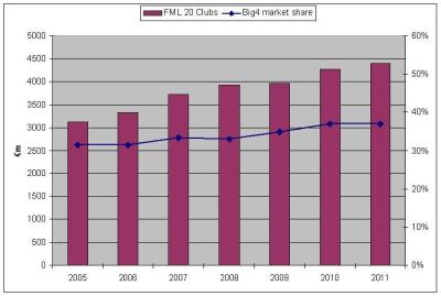 Denna polarisering syns mycket tydligt på samtliga nivåer. Nedastående figurer visar utvecklingen i intäkterna i A) Premier League. B) De fem största förstaligorna i Europa i förhållande till resterande förstaligor. C) De fyra till intäkter största klubbarna i Europa och deras marknadsandel av de klubbar som represeneteras i Deloitte Football Money League. Det vill säga de till intäkter 20 största klubbarna.