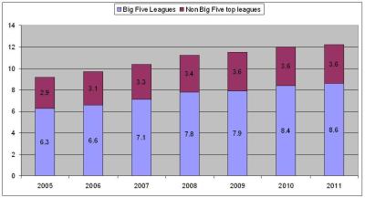 | Fig [B] Figuren visar de samlade intäkterna i Europas högstaligor (€miljarder). Big Five Leagues utgörs av Premier League, Bundesliga, La Liga, Serie A samt franska League 1. |