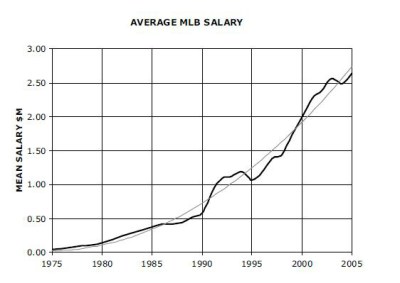 En annan modell är den som vi känner från Nordamerika. Där finns det en hel drös av kostnadskontrollmekanismer* som begränsar spelarnas förhandlingsstyrka. Men klubbarna i Nordamerika vill å andra sidan tjäna pengar vilket innebär att de likt klubbarna i Europa intäktsmaximerar. Så även om spelarna i de amerikanska ligorna exploateras så får de ta del av klubbarnas ständigt ökade intäkter. För skulle spelarna exploateras för mycket så skulle de naturligtvis starta en egen liga. Klubbägarna kan ju inte spela baseball. Figuren nedan visar löneutvecklingen för spelarna i Major League Baseball. Och fakta i målet är att deras lönetillväxt har varit betydligt mer kraftfull än vad deras engelska kollegor har upplevt. Mellan 1975 och 2005 har medellönen ökat med 5800%.