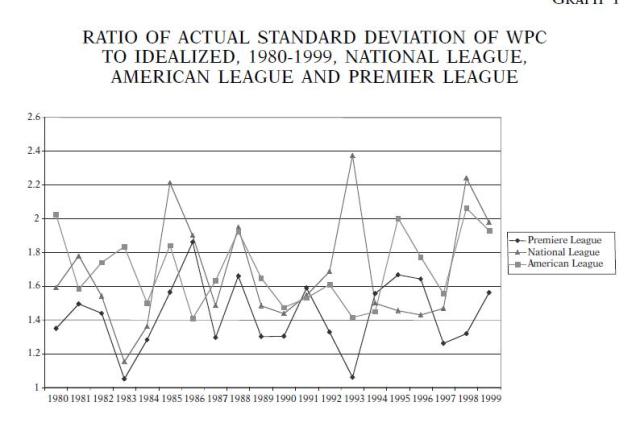 De heldragna linjerna visar det verkliga utfallet. Erfarenheten från MLB visar oss att ligan är mycket välbalanserad över tid. De empiriska resultaten från England visar samtidigt att 30 lag lyckades att ta sig till topp 5 under den 50 år långa perioden mellan 1950 och 2000. Det kan sättas i relation till de 82 klubbar som i teorin förväntas att nå topp 5 vid ett perfekt balanserat divisionssystem.