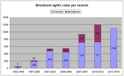 Sedan ett tag tillbaka pågår försäljningen av de internationella sändningsrättigheterna. Under den föregående auktionen som ägde rum för tre år sedan, mer än fördubblades intäkterna från dessa rättigheter. Totalt handlar det om 213 kontrakt runt om i världen. Figuren nedanför visar utvecklingen i Premier Leagues intäkter från sändningsrättigheter, både nationella och internationella.