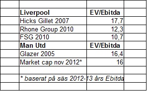 Vi borde med andra ord också kunna analysera konkurrensfördelarna från ett marknadsperspektiv med hjälp av värderingsmultiplar. En välanvänd multipel är EV/Ebitda***. Företag med en högre tillväxt har generellt en högre multipel. Det har också företag som har en lägre risk och företag vars återinvesteringsgrad**** är lägre. Både Liverpool och ManUtd exponeras mot samma affärsrisker. Man verkar på samma konkurrenslandskap. Om det nu är så att klubbarnas EV/Ebitda multipel skiljer sig åt så beror det i första hand på att konkurrensfördelarna värderas olika. Eftersom båda klubbarna under de senaste åren har varit inblandade i transaktioner på ägarsidan så är det möjligt att få fram multiplerna. Tabellen nedan visar de två klubbarnas multipler över de senaste åren.