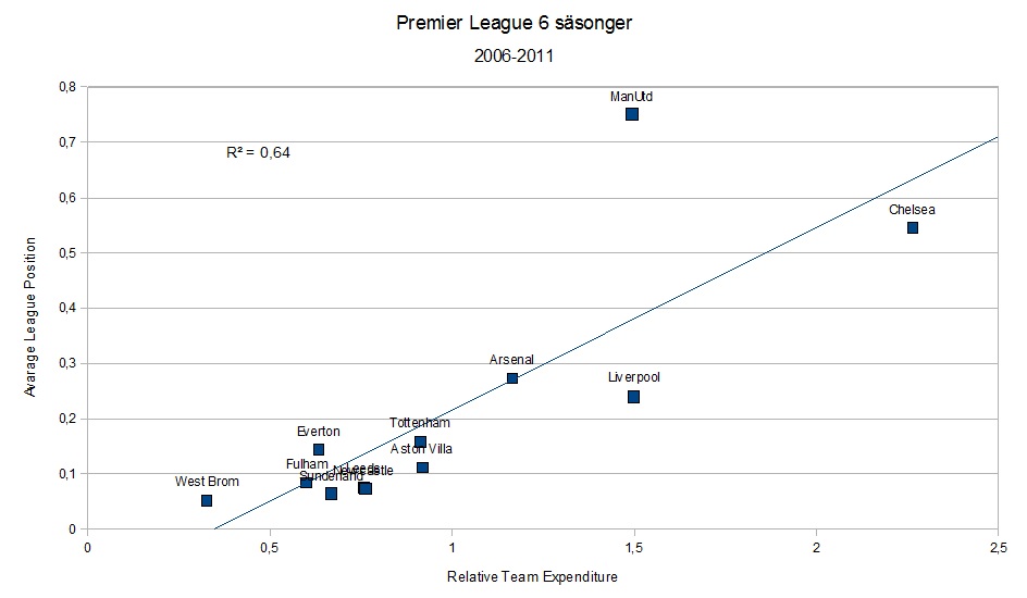Så vad har hänt sedan dess? Som förväntat föll Nottingham Forrest tillbaka till sin ursprungliga nivå efter att Brian Clough hade lämnat klubben. Precis samma öde som de andra klubbarna som Clough var manager för gick till mötes efter att han hade slutat. Manchester United förbättrade sin effektivitet och började prestera enligt vad man ska förvänta sig givet klubbens resurser. Liverpool däremot har stegvis försämrat sina prestationer. Enligt samma metod** som Fillippo dell’Osso och Stefan Szymanski använde sig av har jag gjort en jämförelse över ett urval av klubbar. Tyvärr hade jag bara tillgång till data för säsongerna 2005/06 till 2010/11 vilket gav en kortare tidsperiod (6 säsonger). Jag har också bytt ut Nottingham, Southampton samt Leeds och ersatt med Sunderland, Fulham och West Ham. Regressionsanalysen för samtliga 12 klubbar har en förklaringsgrad på 64 procent. ManUtd passar inte in i modellen och om man tar bort den så ökar förklaringsgraden till 90 procent.