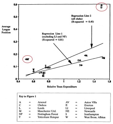 Analysen utgår från relativa sportsliga prestationer samt tolv olika klubbars kostnader för att uppnå dessa och kan kanske ha varit den första analysen i sitt slag. Mätperioden var mellan 1974 och 1989 och den regressionsanalys som författarna gjorde har en förklaringsgrad på 40 procent. Det är två klubbar som inte passar in i modellen, Liverpool och Nottingham Forest. Tog man bort dessa två klubbar så kunde sportslig framgång till 81 procent förklaras genom de pengar som klubbarna spenderade på löner och på transfermarknaden.