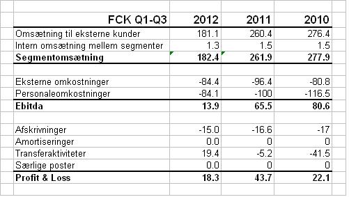 Idag släppte Parken Sport & Entertainment sitt kvartalsresultat där man bland annat uppjusterade prognosen för den förväntade vinsten 2012. En del intressant information finns att finna i segmentsredovisning där FC Köpenhamns resultat redovisas. Anmärkningsvärt är hur väl klubben har kunnat managera sina personalkostnader efter de intäktsmässigt framgångsrika bokslutsåren 2010 och 2011 (tack vare grupp- och slutspel i Champions League).