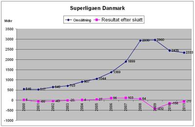 Trots en mindre kostym leder FCK den danska ligan tämligen överlägset med 9 poängs marginal efter 18 omgångar. I maj 2011 vann FCK ligan i överlägsen stil med 26 poäng. Året efter förlorade man titeln lite snöpligt men självförvållat (tränarkarusell pga dålig scouting) till FC Nordsjälland. Men saken är den att Nordsjälland är en liten klubb och idag saknas det en stark utmanare till FCK i Danmark. I samband med finanskrisen krashade intäktstillväxten bland de danska klubbarna och majoriteten brottas med stora ekonomiska problem. Senast igår kunde vi läsa att FC Midjylland är i ett akut behov av likvida medel. Figuren nedanför visar de danska klubbarnas samlade intäkter och resultat före skatt. Detta återspeglas också mycket väl på transfermarknaden vilket jag uppmärksammade i denna analys efter att det internationella transferfönstret hade stängt för året.