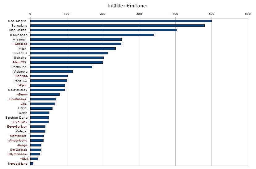 Av de 16 lag som har eliminerats i gruppspelet tillhörde 12 av dessa den nedre halvan i rangordningen. 9 av 10 klubbar med lägst intäkter blev utslagna och 8 av 10 klubbar med högst intäkter spelar vidare i turneringen. Det är faktiskt så att vi med en ganska stor säkerhet kan säga att de fyra lag som kommer att mötas i semifinal våren 2013 finns bland de 10 översta klubbarna i diagrammet. Kanske kan det 11:e rankade Borussia Dortmund skrälla sig till semifinal. För tittar vi tillbaka på de sex senaste turneringarna så är Lyon (2010) och Schalke04 (2011) de enda klubbarna utanför Europas till intäkter 10 största som har lyckats kvalificera sig till semifinal.