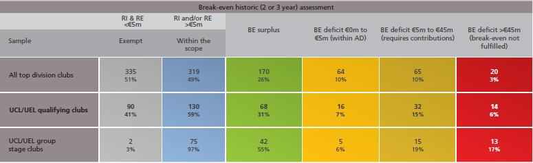 335 klubbar var inte tillräckligt stora för att omfattas av ”break even” kriterierna. 170 klubbar hade ett överskott i sina böcker och 64 klubbar hade ett tillåtet underskott, det vill säga upp till €5 miljoner över treårsperioden.