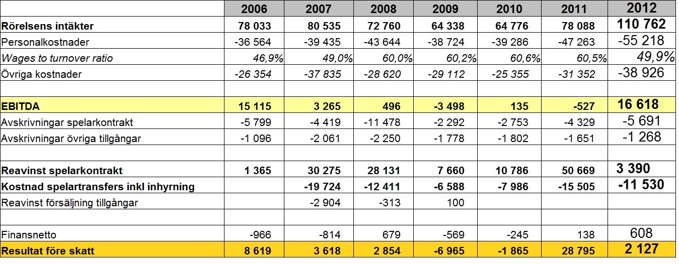 Utöver personalkostnaderna kostnadsförde Helsingborg 15.5 mkr för spelartransfers samt inhyrning under 2011 samt 11.5 mkr under 2012. Totalt 27 mkr. Lägg därtill de på balansräkningen aktiverade immateriella tillgångarna som avser förvärv av spelarkontrakt. 12.3 mkr under 2011 plus 11.6 mkr under 2012. Kostnaden för dessa aktiviteter utgörs av avskrivningar på tillgångarna. Uppskattningsvis 3 mkr från 2011 och framåt och ytterligare 2.5 mkr från och med 2012. 8.5 miljoner kronor med andra ord.