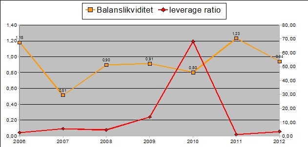 Figuren nedanför visar Helsingborgs finansiella status. Leverage-ratio representerar skuldsättningsgraden (förhållanden mellan skulder och eget kapital). Den har ökat något under 2012. Dels skeppade klubben ut 17 mkr till kommunen vilket minskade det egna kapitalet till 12 mkr. Dels så fick man låna 4 mkr vilket har stärkt balanslikviditeten som utgörs av omsättningstillgångar dividerat med kortfristiga skulder.