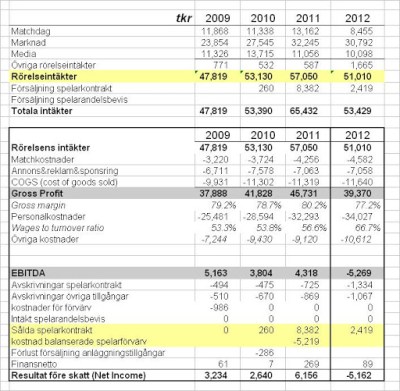Under 2012 kunde vi se ett stort intäktsbortfall vilket till stora delar förklaras i en kraftig nedgång under matchdagen. Denna intäktsminskning är naturligtvis kopplad till de svaga sportsliga resultaten som börja sig gällande redan under 2011.