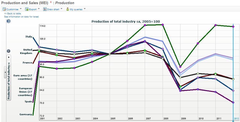 Men den tyska fotbollen har också haft mycket god draghjälp av den tyska industrin. Figuren nedanför visar utvecklingen i industriproduktionen där tyskarna har varit mycket starkare än sina största konkurrenter på den europeiska marknaden för fotboll. Tyskland har en mycket stor exportindustri som på kortare sikt har gynnats av medlemskapet i EMU (undervärderad valuta håller produktiviteten på en hög nivå). Starkare tyska företag har kunnat sponsra tysk fotboll med mer pengar.