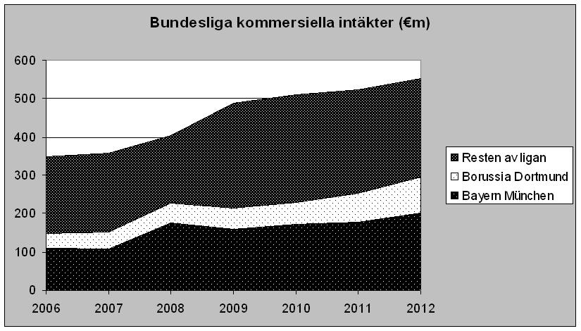 Även om Borussia Dortmund har gjort ett fantastiskt arbete så har det finansiella gapet upp till Bayern ökat. Figuren nedanför visar att sponsor och de kommersiella intäkterna i Bundesliga har ökat med €200 miljoner sedan 2006. Bayern München har fått €100 miljoner av denna ökning. Dortmund €50 miljoner och resterande klubbar har fått dela på €50 miljoner.