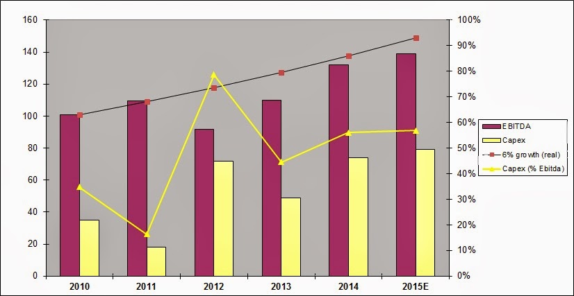 Aktiekursen speglar förväntade framtida vinster. Strax innan Manchester United börsintroducerades så skrev jag att en kurs på $18 per aktie borde spegla en förväntad Ebitda tillväxt på 6 procent om året*. Ebitda är alltså rörelseresultat före ned- och avskrivningar, skatt samt räntenetto. Men det stannar inte här. Företag behöver också återinvestera en del av sina vinster för att kunna bedriva sin verksamhet vidare. I Manchester Uniteds fall motiverar en aktiekurs på $18 att framtida återinvesteringarna (Capex) inte ska vara högre än 1/3 av Ebitda.