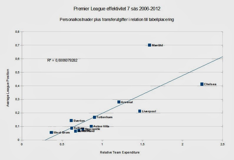 Figur 3 förklarar varför ManUtd historiskt har kunnat vara så pass lönsamma som de har varit. De har presterat extremt bra i förhållande till spenderade pengar (även om de har spenderat betydligt mer än genomsnittet).