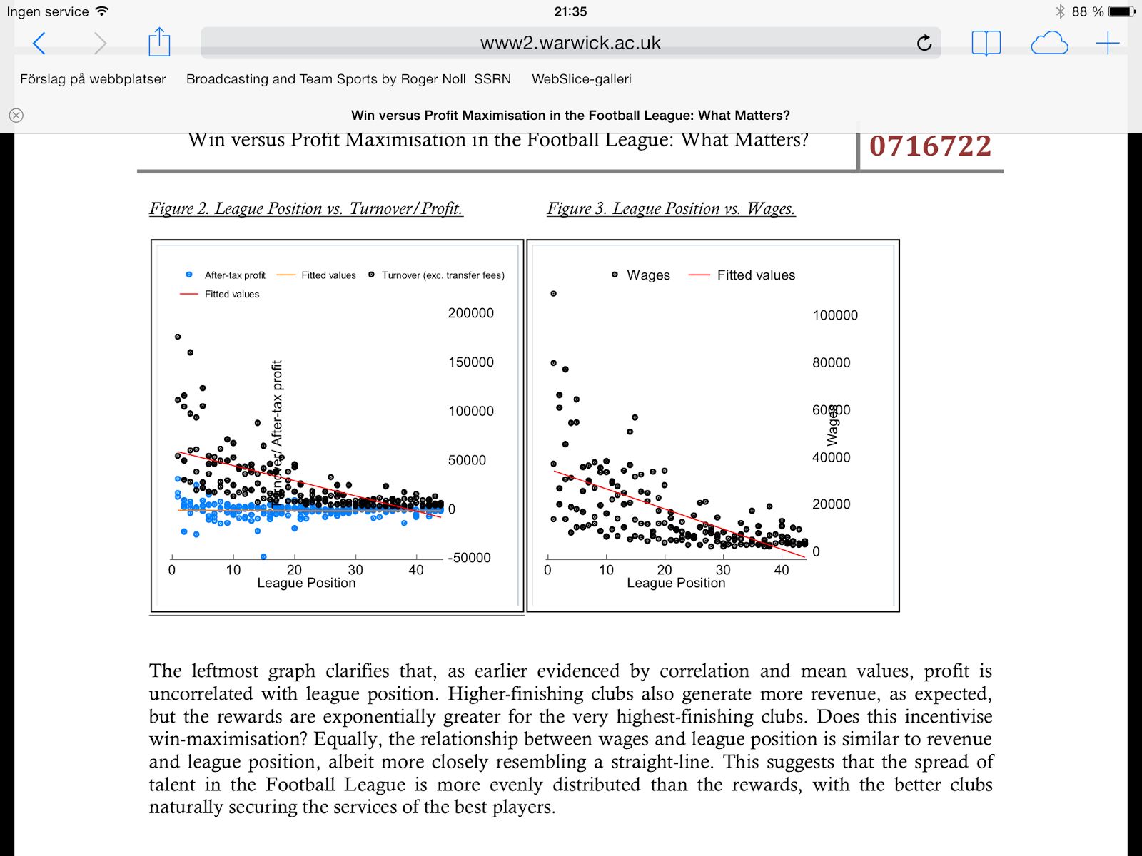 Jag är litet tveksam till den rätlinjiga kurvanpassning som gjorts i ”Figure 2” och ”Figure 3” och som ska visa sambandet sportsliga resultat-omsättning/vinst/lönsamhet. Rent visuellt och utan att ha tillgång till grunddata tycker jag mig skönja exponentiella samband för alla tre. För vinst-ligaposition verkar sambandet snarlikt den berömda ”hockeyklubban”, dvs det är enbart de allra högst placerade som genererar vinst (två ”uteliggare” med negativa värden bland datapunkterna antar jag är city och Chelsea, som ju är helt ointresserade av lönsamhet).